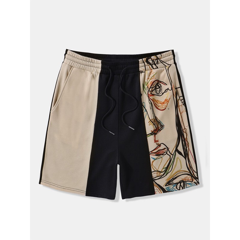 Mens Abstract Face Print Color Block Patchwork Drawstring Waist Shorts
